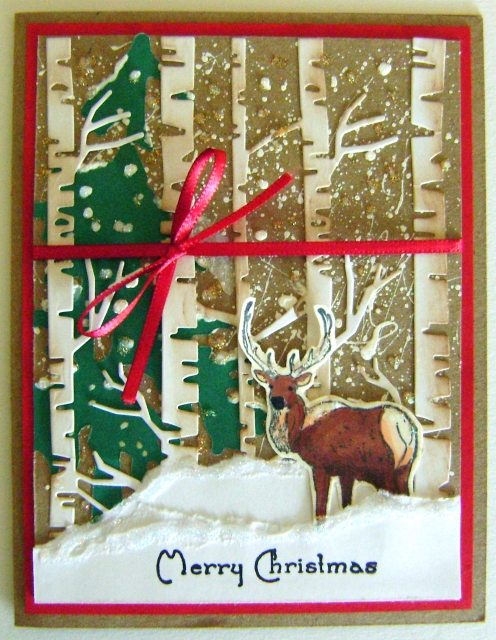 I had fun making splatters! I found the green tree in my stash and I used a brand new birch tree die that i cut from white cs. I sponged a little tan color here and there on the trunks and limbs. I stamped the elk and colored him with Spectrum Noir alcohol markers.. I tore white cs for snow banks and used stickles to look snowy. I also dotted stickles over the snow but it is hard to see in the picture. Thanks for the fun challenge!