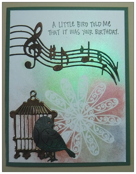 I am not sure if this card applies to the challenge. I had dies on the brain for some reason. I think these would be considered products and tools. Anyway, I used 3 different dies that I had never used. The bird cage came in a set of 2, the bird came in a set of 4 birds, and the music notes is a die by itself. All of these dies are unbranded. I cut the music and bird from a background where I had brushed on Pearl X powders on black cs. I cut the birdcage from a metal sheet. I brushed some Pealr X powders on the bottom right of the card, stamped the flower with VM ink and that pulled off the color to leave the stamp impression.