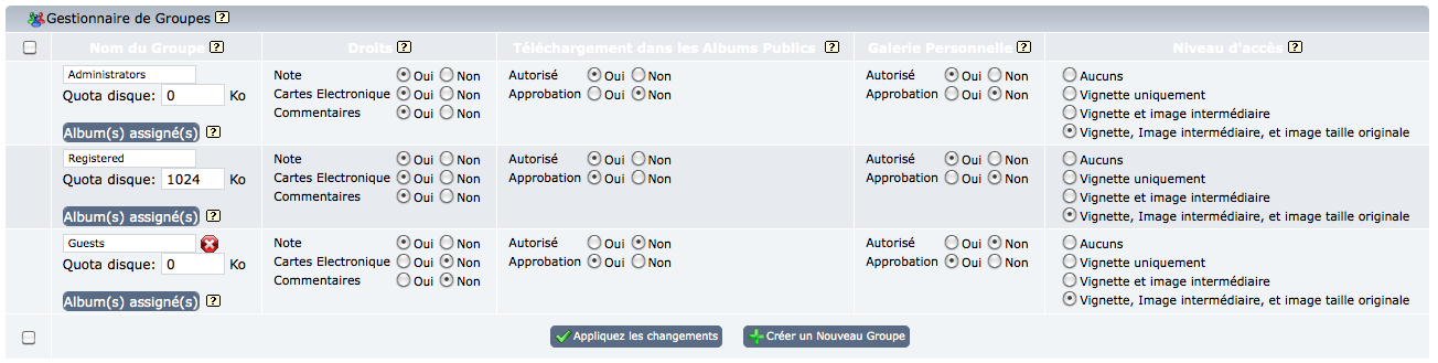 C’est l’endroit ou vous définissez ce que peuvent faire et ne pas faire les membres des groupes. Avec Coppermine, vous ne donnez pas de privilèges à chaque utilisateur, mais à des groupes. Les utilisateurs peuvent être dans différents groupes, afin que vous puissiez déterminer les niveaux hiérarchiques.