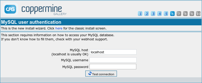 In this step you will be prompted for your mysql data. You can not fake the mySQL information during install or provide it later, you must know it before hand, and enter the information as required. If you're not sure about the information required, ask your webhost. The coppermine support team will not be able to tell you what needs to be entered here - you will have to ask your webhost for that information.