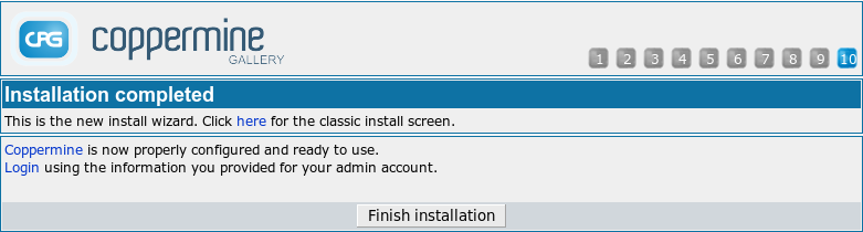 Once you see that final screen, you have made it - congrats. Click on the button at the bottom or any of the links that will send you to your new gallery's index page or the login screen where you can log in as admin to configure your gallery.